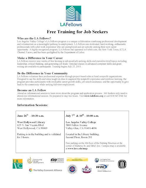 We are very proud to have been invited back to conduct an information session for Cohort 12 of the LA Fellows at the JVS WorkSource location at the beautiful West Hollywood Library on June 26th at 10:30am. We have also added another on-campus orientation on July 10th at Los Angeles Valley College, home of the LA Fellows program, where we'll be answering questions and explaining the program to all interested job seekers and others. Go to www.lafellows.org/apply for all the details.